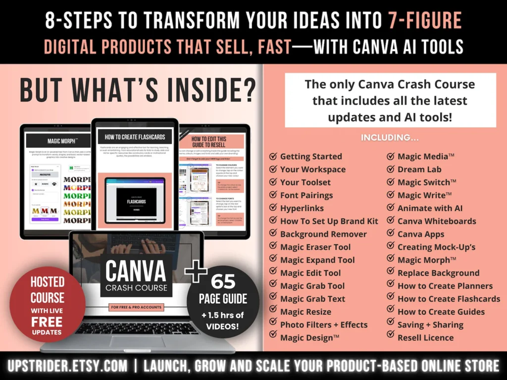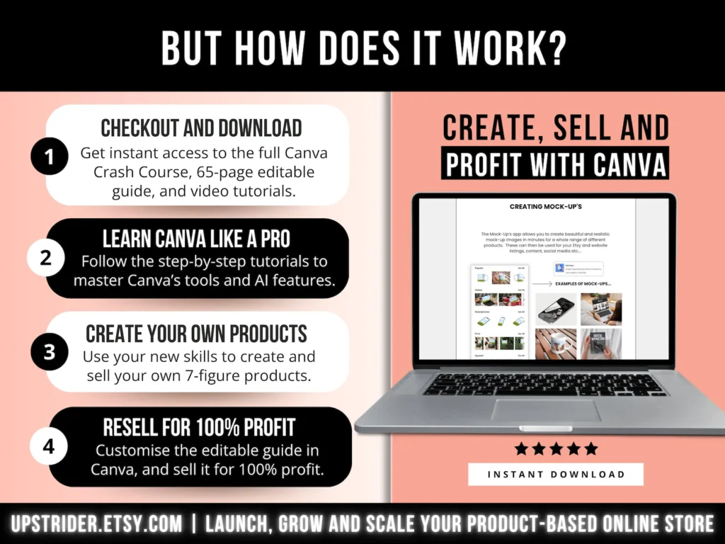 Get a 65-page guide + 1.5 hours of video training explaining the full process from creation to selling.